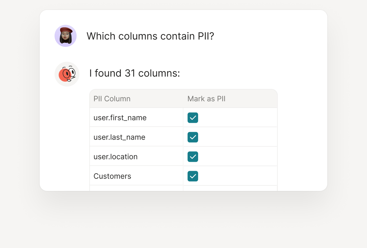 Automatically mask PII in resource queries before Secoda AI processing, and control SQL query access via integration-level permissions.