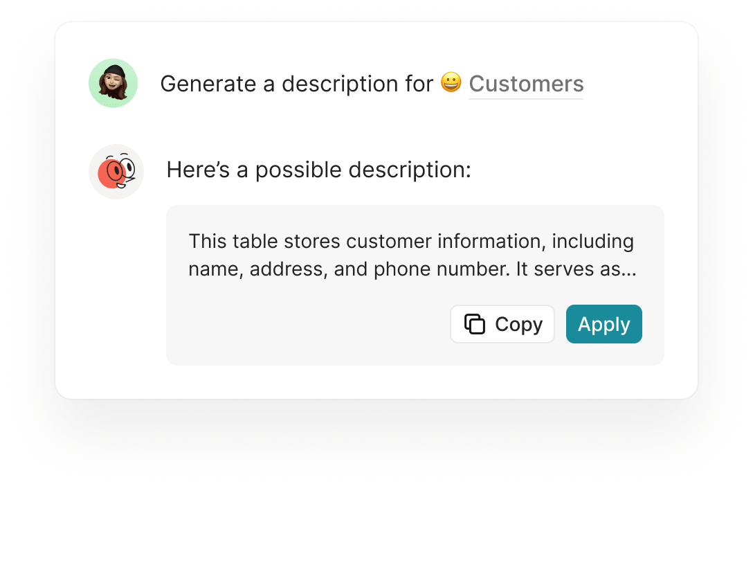 From debugging a SQL error, documenting a new source, or tracing upstream dependencies, Secoda AI explains, respects permissions, and links back to source.